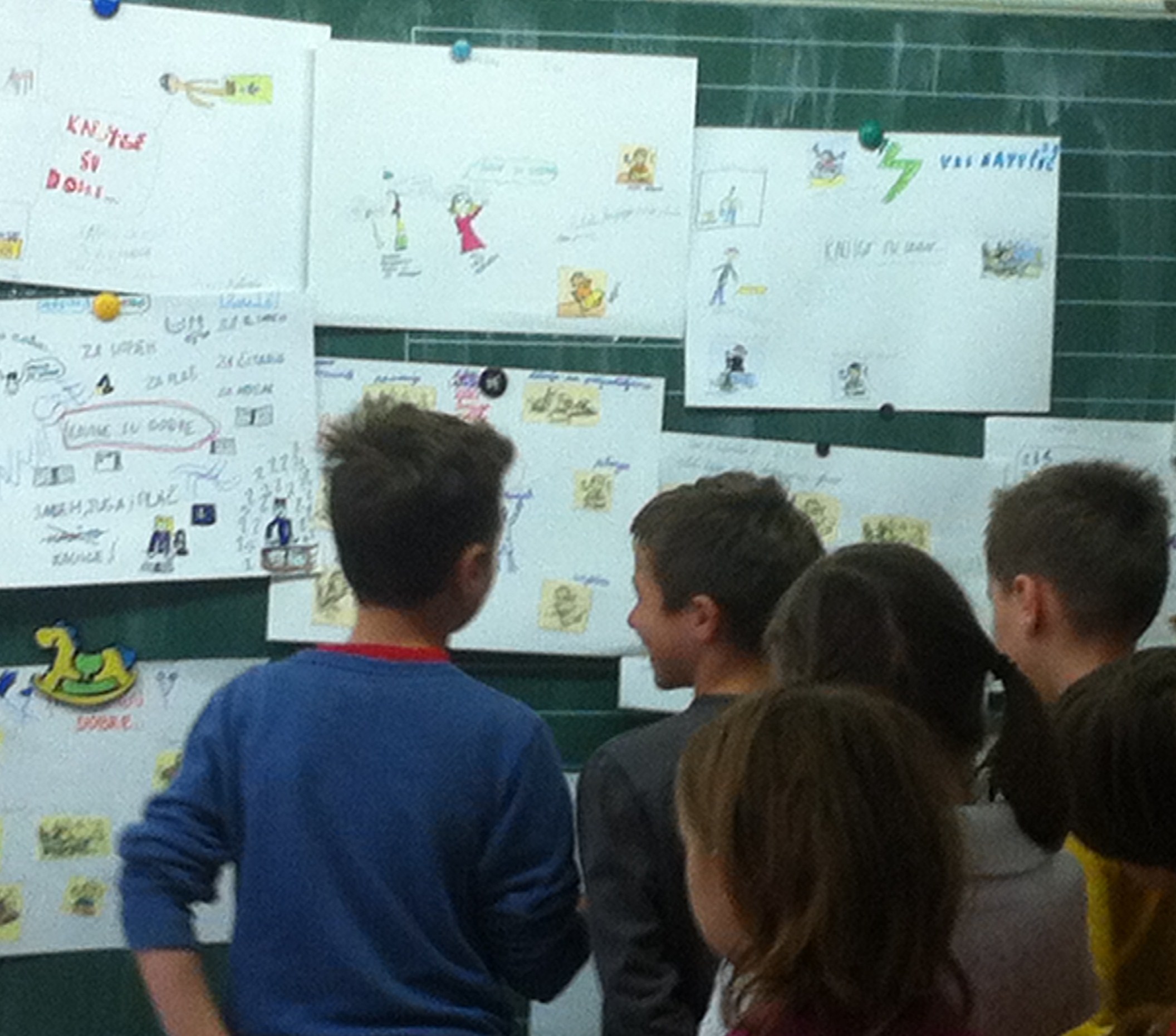 Učenici četvrtog a i prvih razreda razgledavaju plakate koje su zajednički napravili u druženju održanom povodom stogodišnjice izdanja Čudnovatih zgoda šegrta Hlapića.
