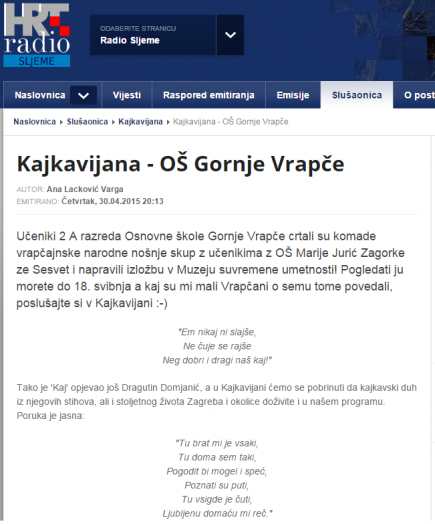 Ova lijepa suradnja je i medijski popraćena. U školi su nas posjatili novinari HRT – radio Sljeme i snimili reportažu o radu u 2. a razredu. Reportaža je emitirana u emisiji Kajkavijana, u četvrtak 30. 04. 2015. Emisiju možete poslušati ovdje.